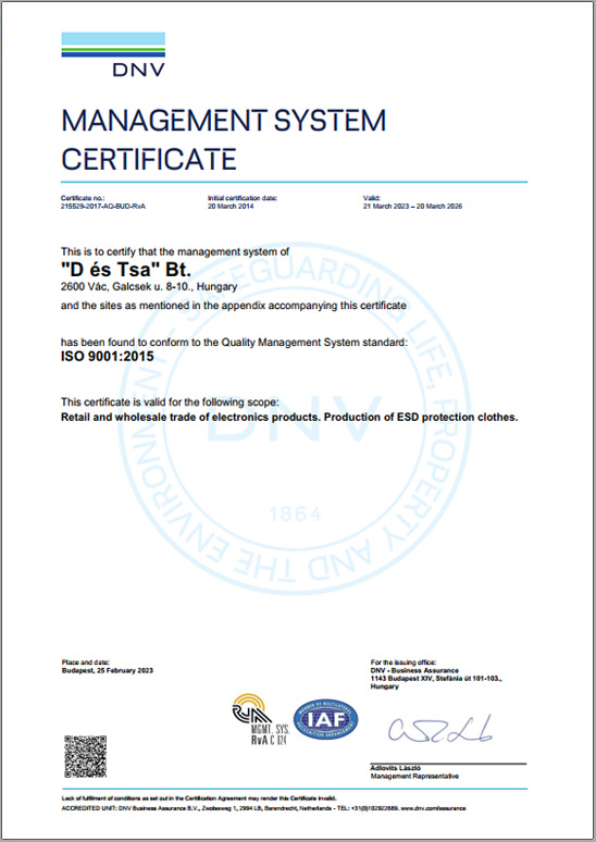 D és Tsa Bt. works on the basis of EN ISO 9001:2015 quality management system.