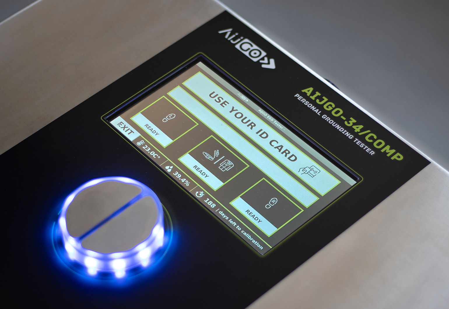 The AIJGO-34/COMP is a tester for checking personal grounding before entering an ESD protected area (EPA). It may be a good choice if you want to identify persons entering the site. Tester with LIGHT BAR system – such AIJGO products have a steel touch button, the measured results are indicated by LED lights. Type with COMPLEX system – these testers are supplied built-in in an entrance gate with turnstile. COMFORT system product – such AIJGO devices have touch button and RFID reader, an RFID card is required for use, which includes the type of test to be used.