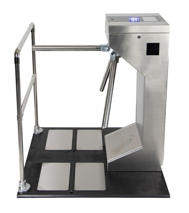 Thanks to the dual foot electrode, the tester simultaneously measures the resistance of the right and left foot relative to the hand. After the test, the measured values are displayed on the built-in LCD display. The measured results are stored on an internal SD card. In the event of a power disconnection, the gate automatically drops down its turnstile to allow free passage.