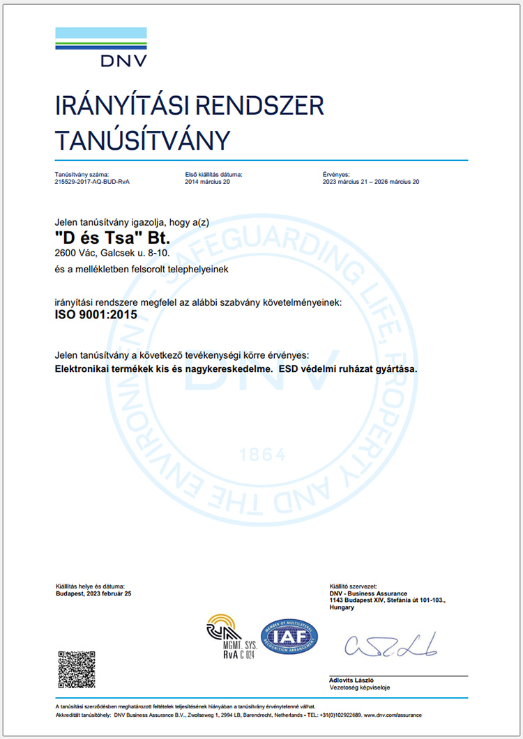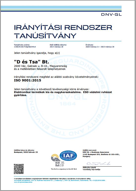 A D és Tsa Bt. az EN ISO 9001:2015 minőségirányítási rendszer alapján működik.