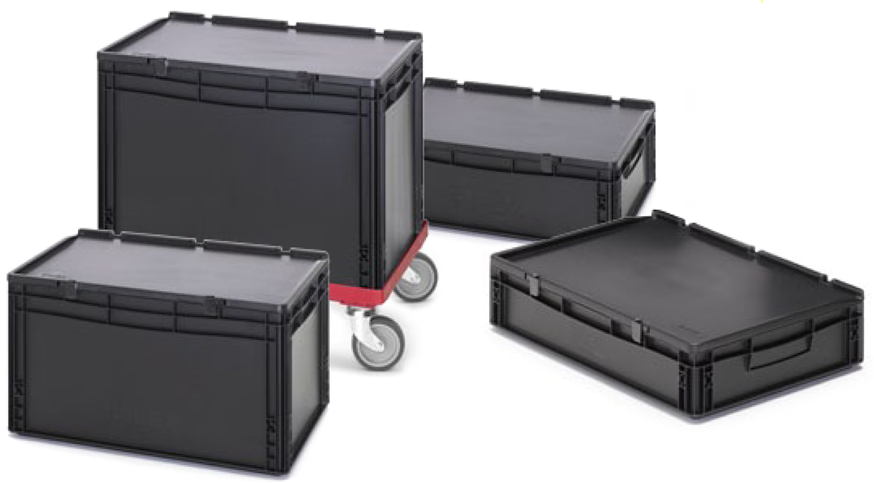 | Description: | ESD containers + Hinged lids + Locks, , stackable, in EURO format |