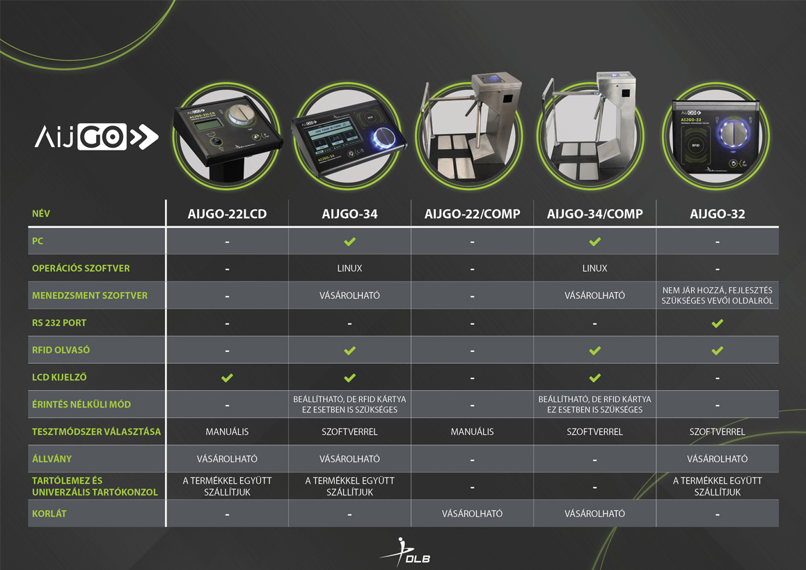 Az AIJGO teszterek segítségével személyi földelés tesztelésére van lehetőség. Alkalmazhatók ESD védett területre (EPA-ra) való belépést megelőző ellenőrzéshez, lábbeli rendszer és csuklópánt/földelhető ESD köpeny rendszer egyidejű tesztelésével. Az AIJGO-22LCD, AIJGO-32 és AIJGO-34 termékek állványra, falra, beléptető kapura vagy asztalra is szerelhetők. Univerzális tartókonzollal és tartólemezzel együtt szállítjuk őket, állványt is rendelhetnek hozzájuk. Az AIJGO-22/COMP és AIJGO-34/COMP termékek esetében a teszterek forgóvillás beléptető kapuba szerelve rendelhetők, amihez korlát is vásárolható. Az AIJGO-34 és AIJGO-34/COMP esetében lehetőség van a belépő személyek azonosítására RFID olvasó segítségével, adatok automatikus rögzítésére, és a rögzített információkhoz való számítógépes hozzáférésre. Az AIJGO-32 eszköz is RFID olvasóval van ellátva, viszont szoftver nélkül szállítjuk, vevői fejlesztés esetén összeköthető lehet vállalatirányítási rendszerrel.