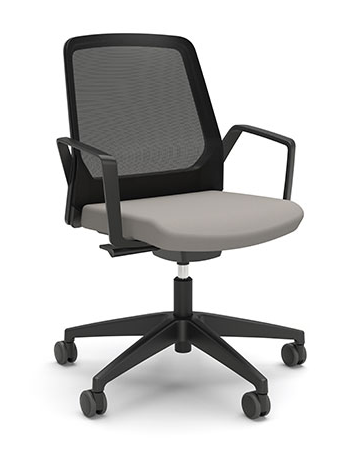 Conference chair with armrests, upholstered seat, mesh-covered backrest |