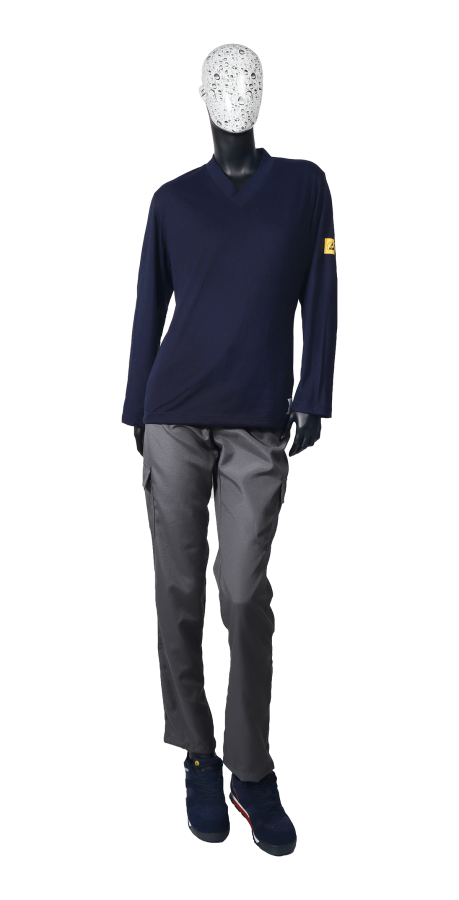 ESD T-Shirt belongs to the SUMMER collection, which is used in summer or in warm manufacturing environments for ESD clothing. Female XS - 5XL. Slim style. V-neck. Without any pocket. ESD logo on sleeve. Wide ESD fabrics and colors available. IEC 61340-4-9-2024 and ANSI/ESD STM2.1-2018 ESD certified products.