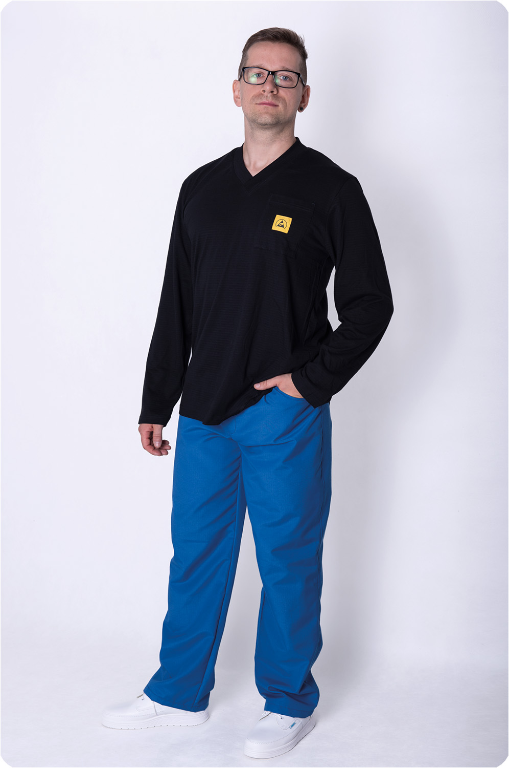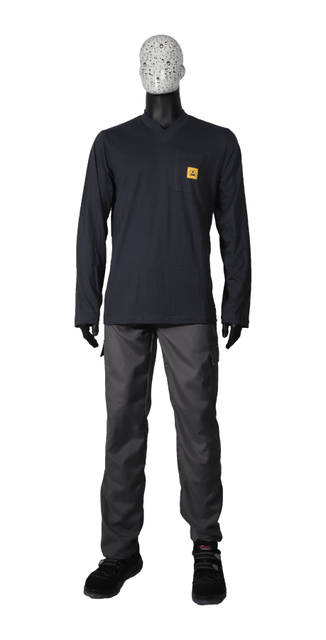 ESD T-Shirt belongs to the SUMMER collection, which is used in summer or in warm manufacturing environments for ESD clothing. Unisex XS - 5XL. V-neck. Breast pocket with ESD logo. Wide ESD fabrics and colors available. IEC 61340-4-9-2024 and ANSI/ESD STM2.1-2018 ESD certified products.