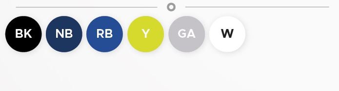 Fekete (BK), Navy kék (NB), Royal kék (RB), Sárga (Y), Szürke (GA), Fehér (W)