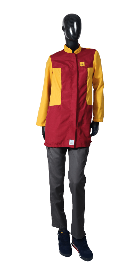 ESD premium smock with award winning design by Borbála Kovács. Standard sizes: Female XS - 5XL 2 side pockets Hidden snap-fasteners Cuff with snap-fasteners ESD logo on the chest area. Choose the most matching colour combination that suits your company. IEC 61340-4-9-2024 and ANSI/ESD STM2.1-2018 ESD certified products.