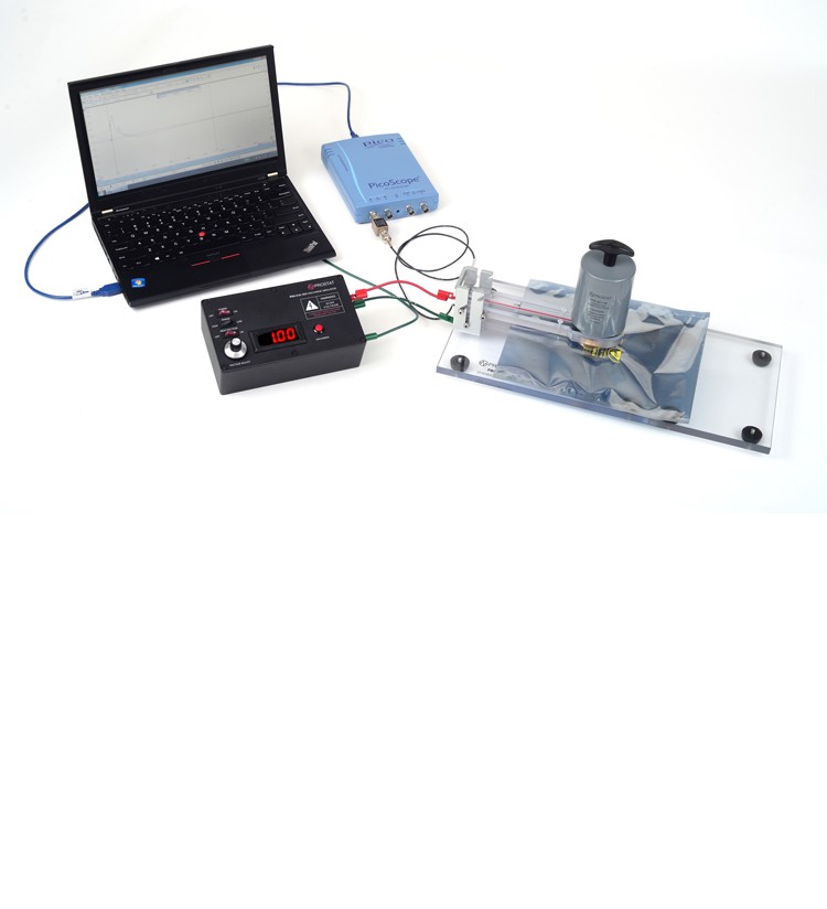 The PBT-531 is a complete system kit designed to evaluate the performance of electrostatic discharge shielded bags and other packaging materials. The portable shielded bag test system is capable of calculating the energy of the discharge pulse inside the shielded bag in accordance with ANSI/ESD STM11.31 and IEC 61340-4-8.
