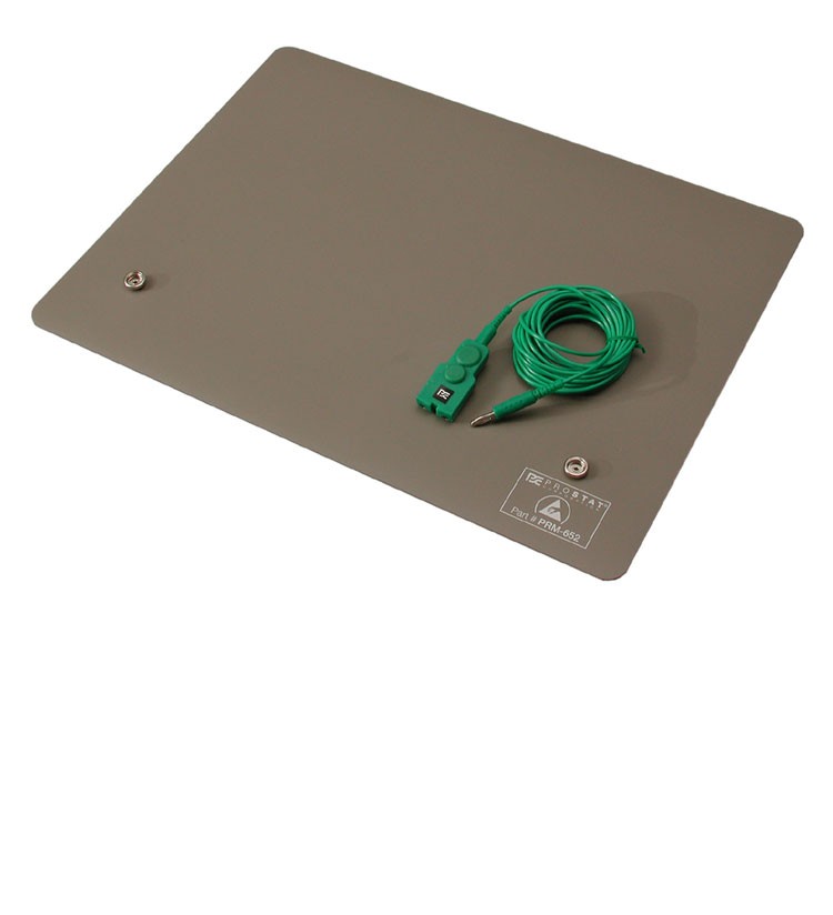 The PRM-652 is a dual-layer synthetic rubber work surface covering with volume functional static dissipative properties. It may be used as a grounded tablemat, as a non-grounded work mat when placed on a grounded surface, or it may be laminated directly to a workbench in place of rigid laminates.