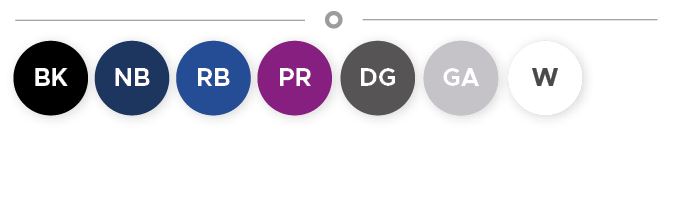 Black (BK), Navy blue (NB), Royal Blue (RB), Purple (PR), Dark Grey (DG), Grey (GA), White (W)
