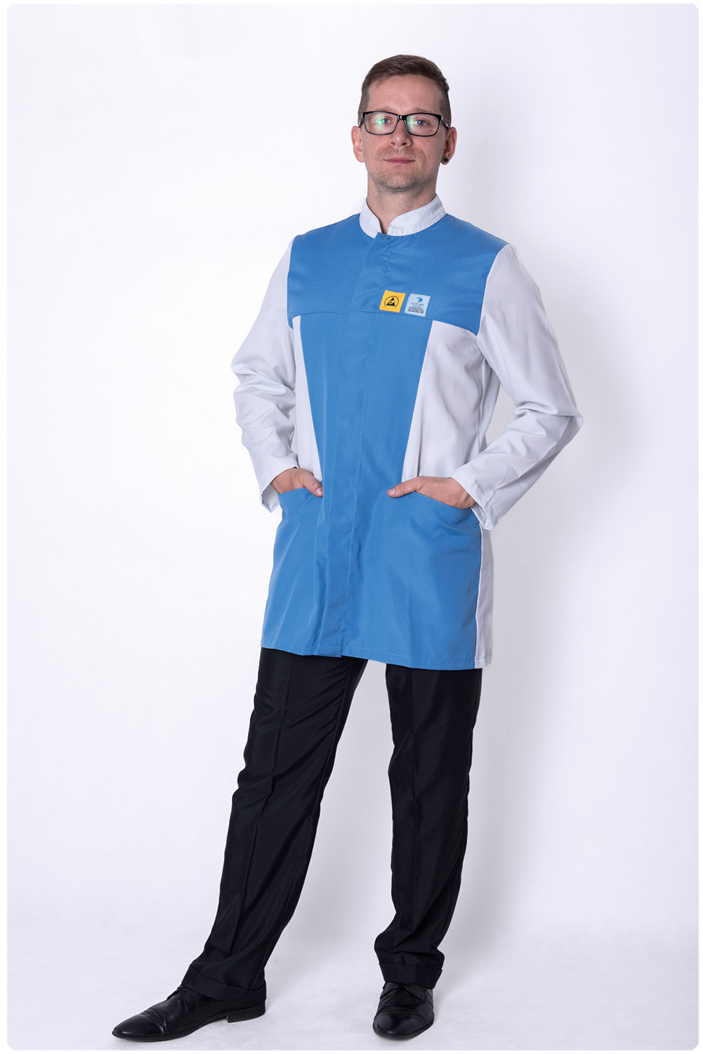 ESD prémium köpeny díjnyertes tervezői kialakítással: Kovács Borbála tervezése. Standard méretek: Férfi XS – 5XL. 2 oldalzseb. Rejtett patentozás. Kézelő patenttel. ESD logó a mellrészen. Válaszd ki a cégetekhez illő színkombinációt! IEC 61340-4-9-2024 és ANSI/ESD STM2.1-2018 ESD szabványok szerint minősített termék.