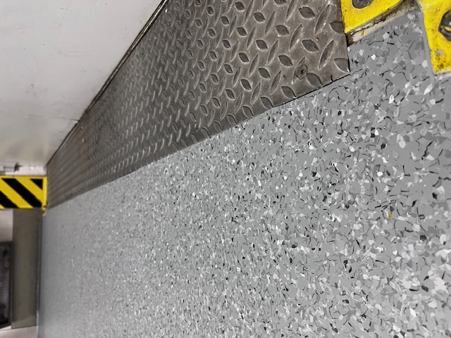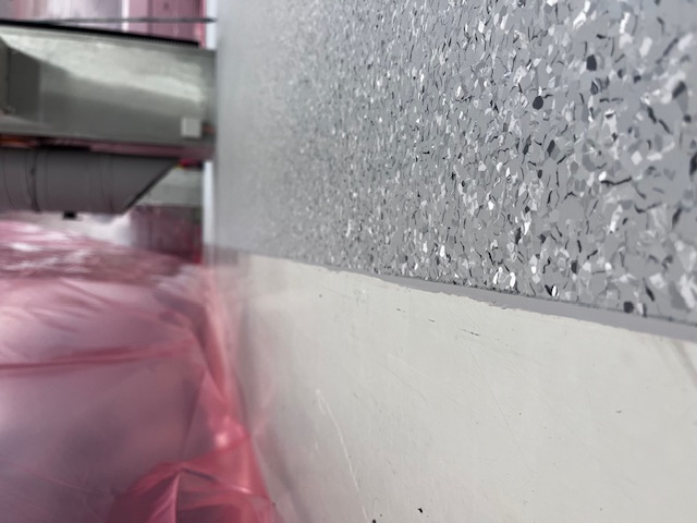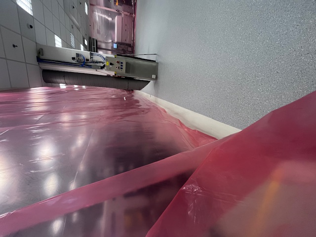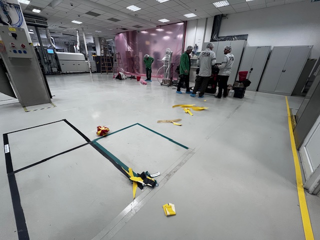 Új padló telepítésével tudjuk garantálni azt, hogy a rajta történő mérés a szabvány szerinti megfelelő mérési értékeket produkáljon. A PVC padló telepítése előtt a terület megfelelő előkészítésére volt szükség a munkálatok megkezdésekor. A korábbi műgyanta aljzatra történt a kivitelezés, viszont volt egy kérdés, amit szükséges volt a PVC leragasztása előtt megoldani. Amennyiben az alappadlózat változatlanul marad, akkor a PVC vastagsága miatt 2 mm vastag szinteltérés jött volna létre a munkaterület és a gyártócsarnok azon többi része között, ahol továbbra is csak a műgyanta burkolat marad a padlózaton. Ugyan a szintkülönbséget egy burkolatváltóval esztétikusan ki lehetett volna küszöbölni, de az ügyfél számára ez nem lett volna megfelelő. A területen igencsak költséges alapanyagokat szállítanak kézikocsikon, és ezek a szállítóeszközök „zökkenhettek” volna ezen a burkolatváltón.