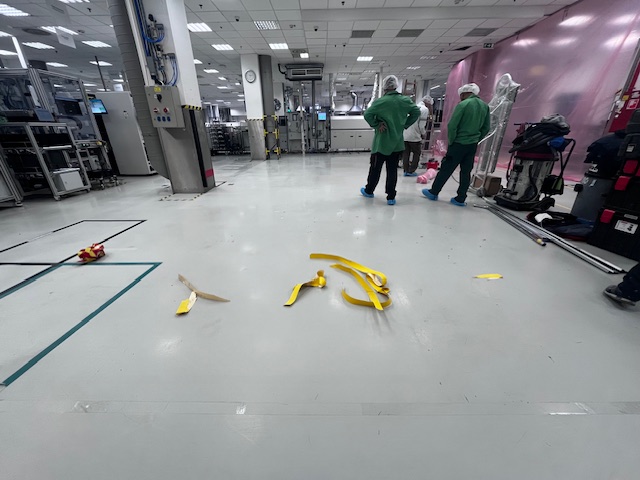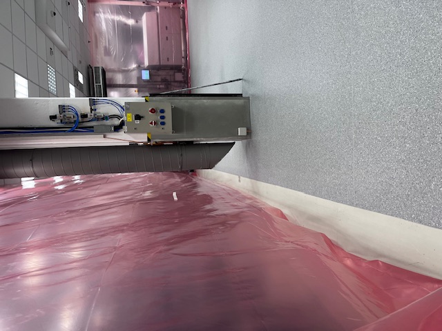 A gyártás az adott területen folyamatosan, a hét minden napján 24 órán át zajlik. Mindenképpen porkizárt megoldást kellett találnunk a bemarás elkészítésére, valamint elvárás volt a munkaterület egyértelmű elhatárolása a gyártócsarnok azon környező részétől, ahol nem történik padlókivitelezés. Ezt ideiglenes fóliafal építésével tudtuk biztosítani a megrendelőnk számára.