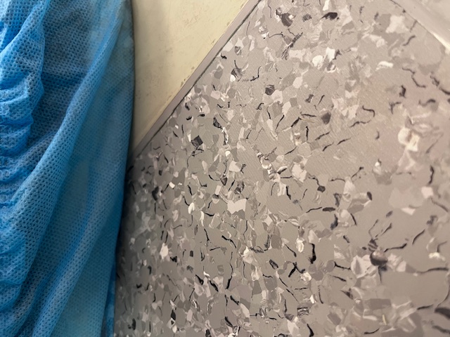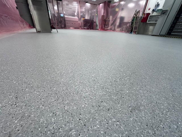 Ennek elkerülése érdekében találtuk ki közösen, hogy „áthidaljuk” a 2 mm-es szintkülönbséget, mégpedig úgy, hogy egy 20 cm-es sávban bemarjuk a műgyantát a munkaterület szélén, minden oldalon pont 2 mm mélységben, és egyfajta rámpaalakot alakítunk ki a műgyantában. Ezzel, ezen a 20 cm szélességen oszlatjuk el a 2 mm szintkülönbséget. A PVC padló telepítését követően így már megfelelő lett a terület a kézikocsik számára is, garantálva a zökkenőmentes közlekedést.