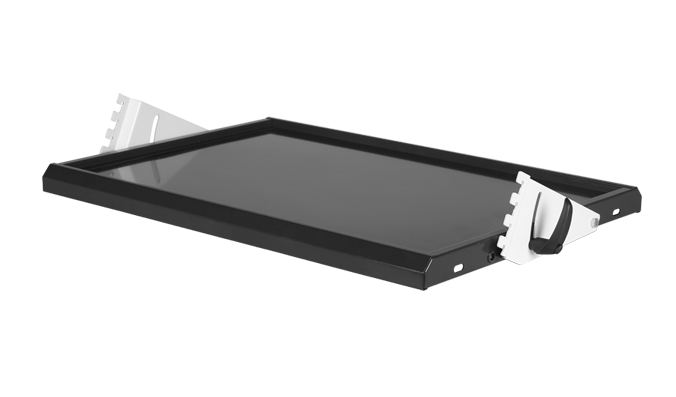 Steel adjustable shelf mounted on a perforated frame by means of special brackets. The design allows for smooth adjustment of an angle in range of 90o - 60o relative to a perforated vertical frame. Enables you to store heavy equipment, and stops prevent movement of devices.