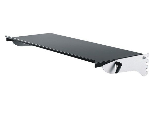 Steel adjustable shelf mounted on a perforated frame by means of special brackets. The design enables for smooth adjustment of an angle in range of 90o - 60o relative to a perforated vertical frame.
