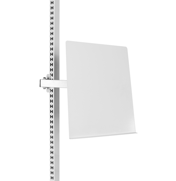 Holder mounted to a frame on desired height. Arm with two joints enables for smooth horizontal adjustment. Joint placed on the back of shelf, enables you to adjust inclination angle.