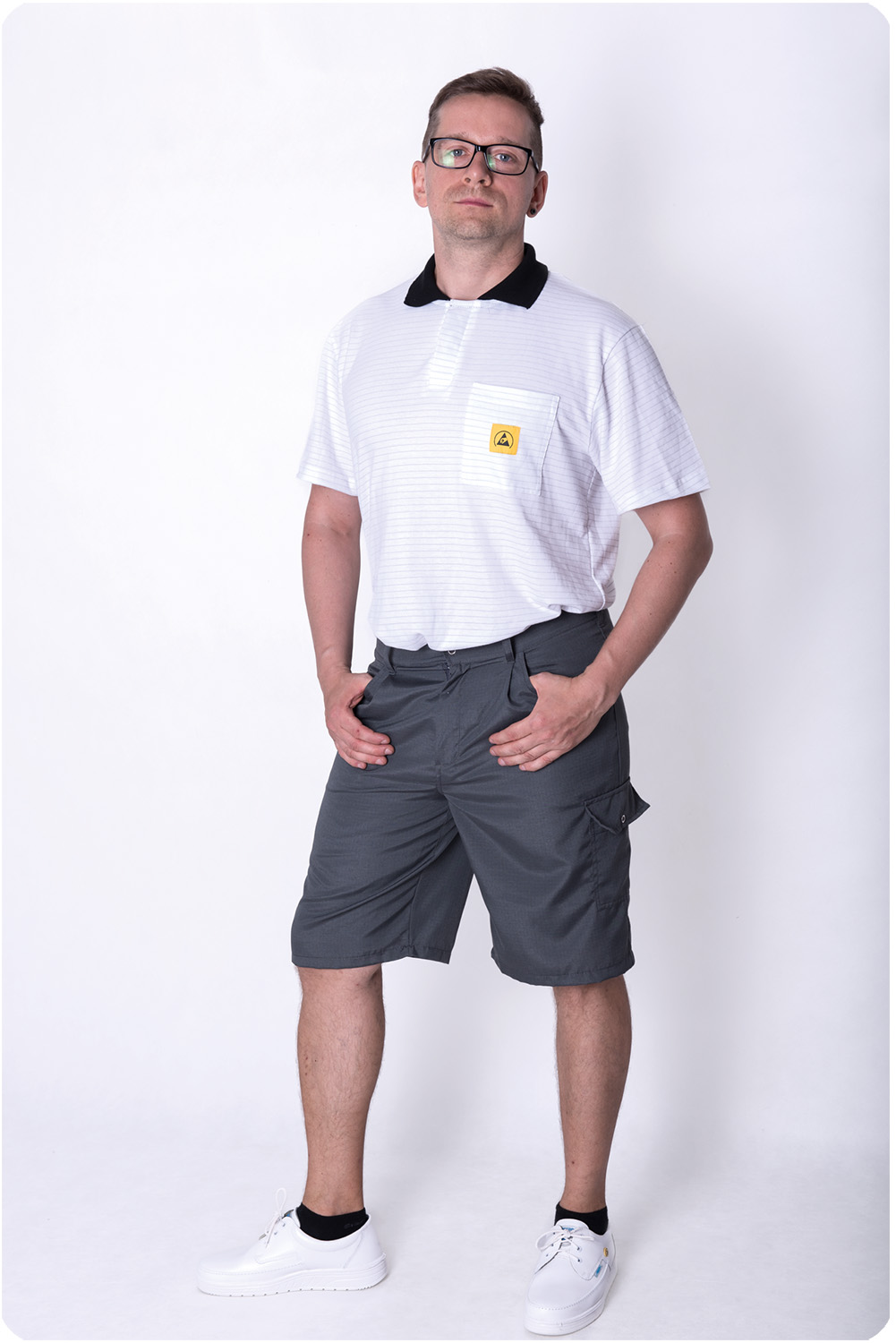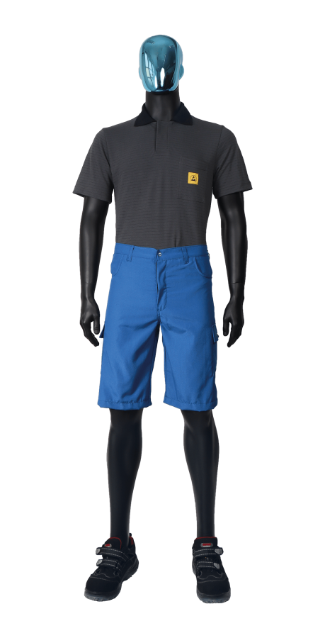 ESD Shorts belongs to the SUMMER collection, which is used in summer or in warm manufacturing environments for ESD clothing. Male XS - 5XL. Straight style. 2 side pockets, 1 hip pocket with ESD logo. 1 side pocket on the leg. 1 tool pocket on the leg. Rubberized waist with snap-fastener. Wide ESD fabrics and colors available. IEC 61340-4-9-2024 and ANSI/ESD STM2.1-2018 ESD certified products.