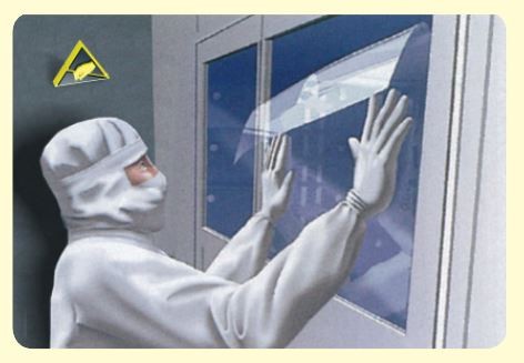 Transparent static dissipative, self adhesive Polyester film. It includes a special abrasion resistant coating on one side and a release film on the other side. It can be applied on flat, insulative surfaces.