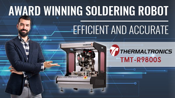 Unlike typical Cartesian robots the Thermaltronics Robot, Model TMT-R9800S, is equipped with full vision, (eyes) to verify the procedure being undertaken and does not simply follow a pre-determined program. In this respect it has an observation mode, a verification mode and as a result – a decision making capability. (Basically a brain). This capability of collecting and utilizing data for production processing is one of the most important factors necessary to meet the requirements of Industry 4.0 standards. Through the use of servo motors and precision ballscrews, the Thermaltronics Robotic system is able to accurately meet the requirements of high speed operation, repeatability and durability. The software is designed to transform system commands into functional operating procedures and with its 6-axis capability, 360° independent fixture rotation, solder tip and solder wire feeding operation from separate axis control, the applications extend beyond conventional soldering and dispensing operations.