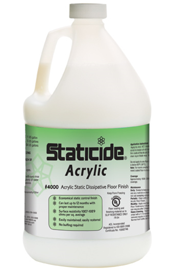 Low cost + high performance = Value Staticide Acrylic is a high-solids, low cost method of protecting your sensitive manufacturing areas from the dangers of static build-up. Easy to apply; perfect for production areas, warehousing, shipping, laboratories and electronic repair facilities.