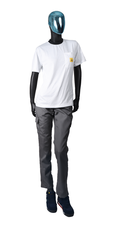 ESD T-Shirt belongs to the SUMMER collection, which is used in summer or in warm manufacturing environments for ESD clothing. Female XS - 5XL. Slim style. Round neck. Breast pocket with ESD logo. Wide ESD fabrics and colors available. IEC 61340-4-9-2024 and ANSI/ESD STM2.1-2018 ESD certified products.