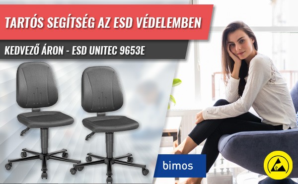 A Bimos márkájú ESD védett székek egyedi védelmi tulajdonságokkal rendelkeznek, alkalmasak lehetnek ESD védett munkaterületen való használatra. Az ESD védett székek töltéslevezetési és felületi ellenállása 106Ω, mely biztosítja, hogy a felhasználója által generált sztatikus töltés megfelelően elvezetésre kerüljön az ESD védett, elektrosztatikus szempontból vezetőképes padlózat irányába.
