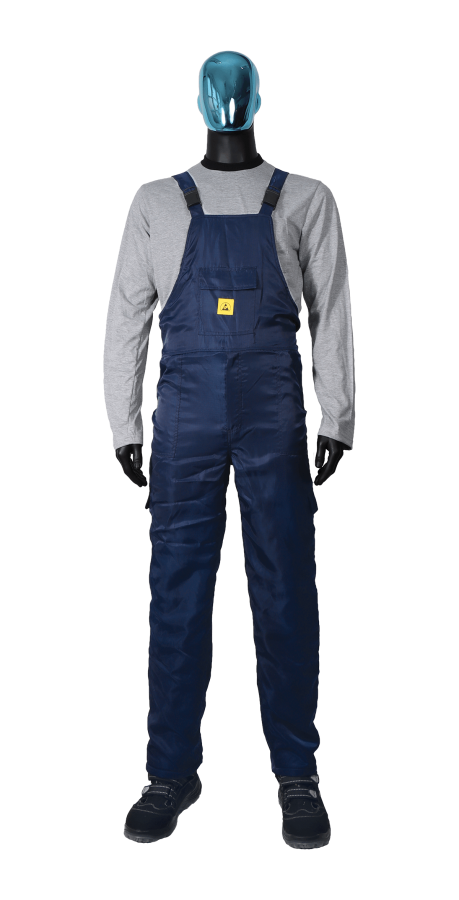 ESD winter trousers with bridles belongs to the WINTER collection, which is used in winter or in cold manufacturing environments for ESD clothing. Inlined. Standard sizes: Unisex XS - 5XL. Fleece lining. Water-repellent outer layer. 2 side pockets, 1 front pocket with ESD logo. 2 side pockets on legs. 2 quick release buckles. IEC 61340-4-9-2024 and ANSI/ESD STM2.1-2018 ESD certified products.